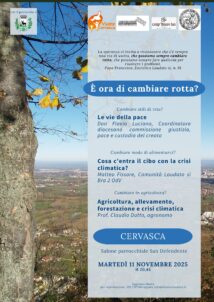 Come ogni anno, verso l'autunno Vivere Cervasca odv propone una serata di riflessione sulle conseguenze dei cambiamenti climatici e sulle proposte che emergono in merito alla produzione di energia, all'uso razionale dell'acqua, alla necessità di non rimanere ancorati a vecchie abitudini. Il tema di quest'anno è proprio il cambiamento: a partire da una frase dell'Enciclica Laudato [...]